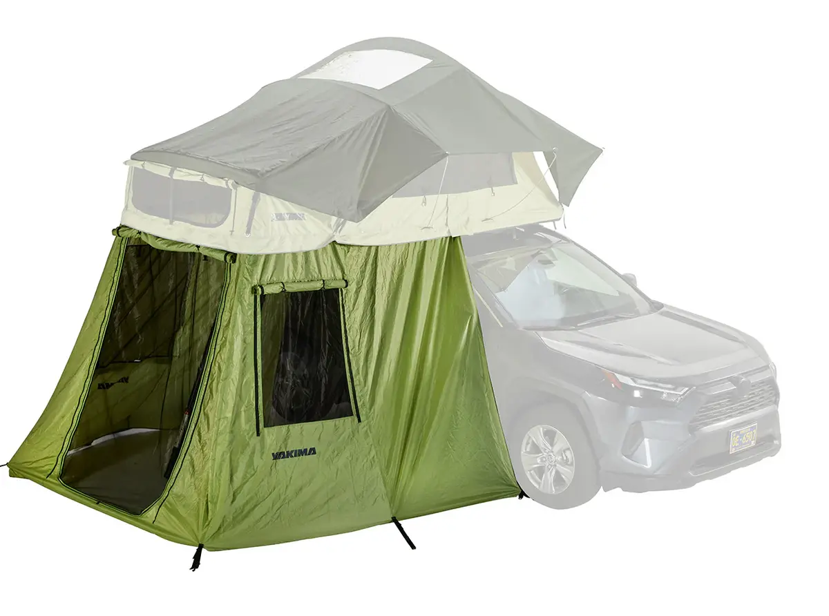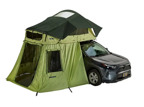 Transform your SkyRise HD rooftop tent into a multi-functional space with the SkyRise HD Annex. Perfectly sized to serve as a kitchen, changing room, storage area, or cozy seating nook, the Annex installs easily around the lower section of your tent, creating a private, ladder-accessed enclosure. Crafted from waterproof, PU-coated 210D ripstop nylon, it keeps you dry when it rains, while two zippered mesh windows provide refreshing airflow in warm weather. With ample attachment points for all your SkyRise accessories and integrated hooks and ground stakes, the Annex stays secure—even during gusty afternoons—letting you relax in sheltered comfort.