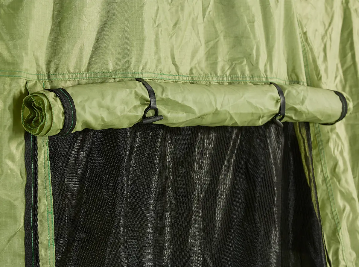 - Zippered mesh door and 2 mesh windows with zippered waterproof fabric covers