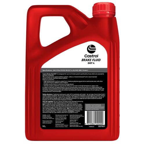 Introducing the CASTROL BRAKE FLUID DOT 4 - 4L, a high-performance brake fluid by CASTROL designed for exceptional braking efficiency. This product is ideal for motorists seeking reliable and smooth braking performance in various driving conditions. With superior heat resistance and optimal viscosity, the CASTROL BRAKE FLUID DOT 4 - 4L ensures safety and precision on the road.