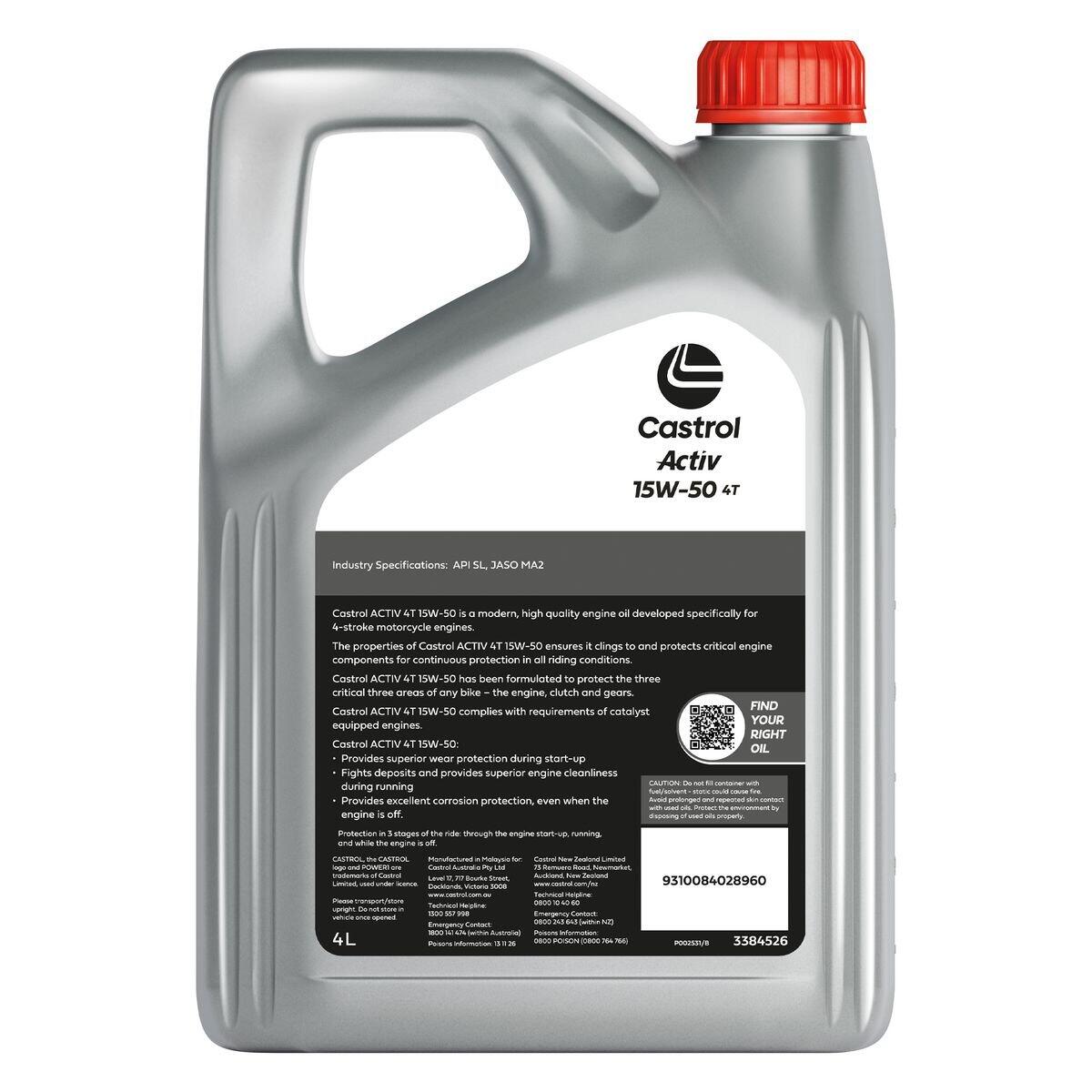Introducing the CASTROL 15W50 - ACTIV 4T - 4L, a high-performance motor oil designed for motorcycle enthusiasts seeking top-notch engine protection and performance. Whether you're a commuter or a weekend rider, this oil is formulated to deliver superior lubrication and ensure optimal engine health in all conditions.