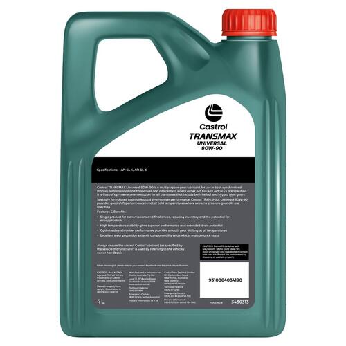 Introducing the CASTROL 80W90 - TRANSMAX UNIVERSAL - 4L. This high-quality lubricant by CASTROL is designed for a wide range of vehicles, offering exceptional performance and protection. Ideal for enthusiasts and professionals alike, this product ensures smooth operation and longevity for your vehicle's transmission.