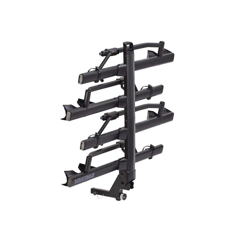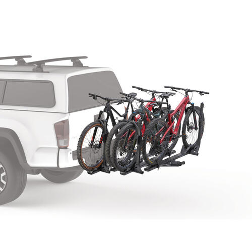 The stadium seating architecture increases ground clearance on rutted trails or steep driveways and its offset tray design further minimizes bike to bike interference and maximizes functionality. The forward-facing remote tilt lever means fast access to the rear area of your vehicle and integrated locking cables combine with your own lock to provide serious security.