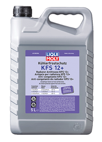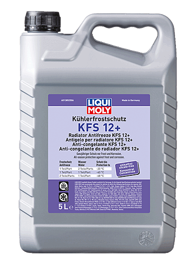 Clean the cooling system with LIQUI MOLY Radiator Cleaner (part no. 3320). Then empty this and rinse with plenty of water. Fill with Coolant & Antifreeze KFS 12+ and water according to the mixing table and the manufacturer’s instructions. We recommend distilled water for this. Depending on water hardness and quality, dilution with tap water is also possible. Disposal according to the local regulations. Change interval according to manufacturer's instructions. Store undiluted only. Miscible with coolants based on ethylene glycol.