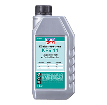 Clean the cooling system with LIQUI MOLY Radiator Cleaner (part no. 3320). Then empty this and rinse with plenty of water. Fill with Coolant & Antifreeze KFS 11 and water according to the mixing table and the manufacturer’s instructions. We recommend distilled water for this. Depending on water hardness and quality, dilution with tap water is also possible. Disposal according to the local regulations. Change interval according to manufacturer's instructions. Store undiluted only. Miscible with coolants based on ethylene glycol.