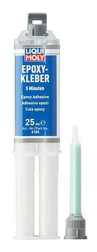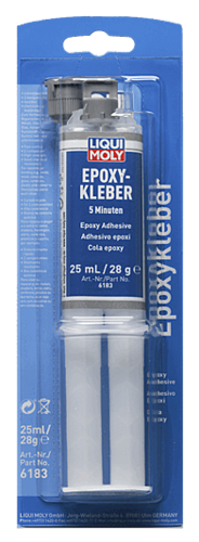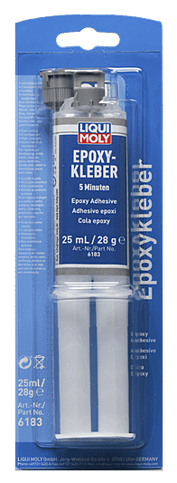 Clean and degrease bonding surfaces with LIQUI MOLY Cleaner and Thinner (part no. 6130). Remove cap or used and cured mixer immediately before use and fit new mixer to cartridge. Apply the adhesive directly to the bonding surfaces. Then join parts and allow to rest. Processing time 5 minutes, ready for use after 20–30 minutes at room temperature. Leave mixer on cartridge after use. Store in a cool, dry place. Note: The adhesive strength is increased by roughening the bonding surface on smooth surfaces.
