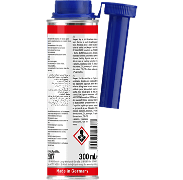 Suitable for all gasoline engines – preventatively or to treat problems. Tested for turbochargers and catalytic converters. To be added directly into the fuel tank. 300 ml are sufficient for up to 70 l of fuel. Effect remains for up to 2,000 km. Can be added directly to the carburetor, even with the engine running.