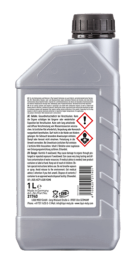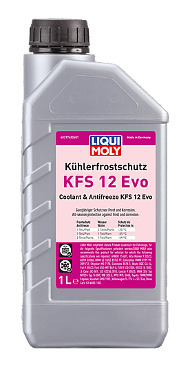Clean the cooling system with LIQUI MOLY Radiator Cleaner (part no. 3320). Then empty this and rinse with plenty of water. Fill with Coolant & Antifreeze KFS 12 Evo and water according to the mixing table and the manufacturer’s instructions. We recommend distilled water for this. Depending on water hardness and quality, dilution with tap water is also possible. Disposal according to the local regulations. Change interval according to manufacturer's instructions. Store undiluted only. Miscible with coolants based on ethylene glycol.