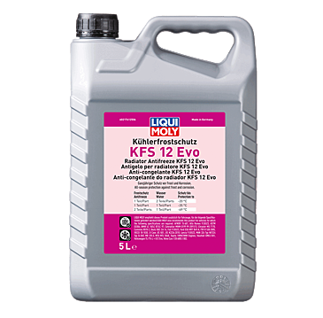 Clean the cooling system with LIQUI MOLY Radiator Cleaner (part no. 3320). Then empty this and rinse with plenty of water. Fill with Coolant & Antifreeze KFS 12 Evo and water according to the mixing table and the manufacturer’s instructions. We recommend distilled water for this. Depending on water hardness and quality, dilution with tap water is also possible. Disposal according to the local regulations. Change interval according to manufacturer's instructions. Store undiluted only. Miscible with coolants based on ethylene glycol.