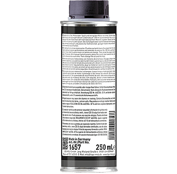 Flushes out and cleans the oil circuits of motorcycles with 4-stroke gasoline engines. The frequency of use is dependent on the degree of contamination of the oil circuit and on the quality of the oil used. 250 ml (1 can) is sufficient for up to 4.5 l of oil.