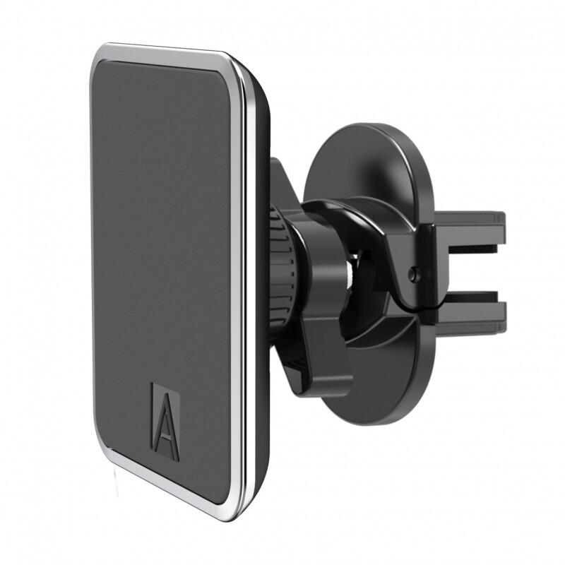 An innovative magnetic mounting system designed to conveniently and securely mount smartphones, tablets and other mobile devices to the air vent in the vehicle. The sleek, cradle-free design uses high-powered, device-safe rare earth magnets to secure your device exactly where you need it, with no arms, legs, or brackets to block access to ports or buttons. The locking clamp base attaches securely to any vehicle air vent and the angle adjustable head combined with 360-degree rotation allows the device to be positioned for the best viewing angle. The kit comes supplied with two magnetic holder plates, one black and one silver, these can be stuck directly to the device or simply placed between the device and its case.